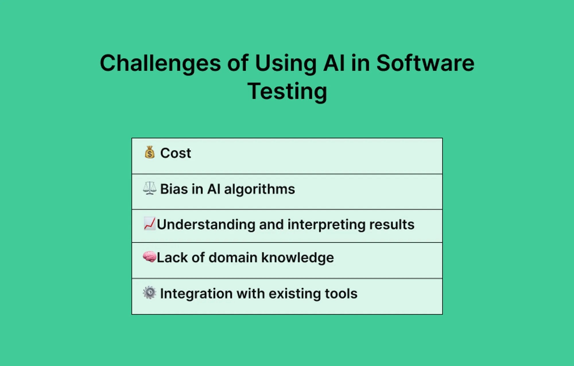 Challenges in employing AI in software testing include managing costs, addressing biases in AI algorithms, comprehending and interpreting results, bridging knowledge gaps, and integrating with existing tools seamlessly. Let’s explore some of the key challenges of using AI testing.