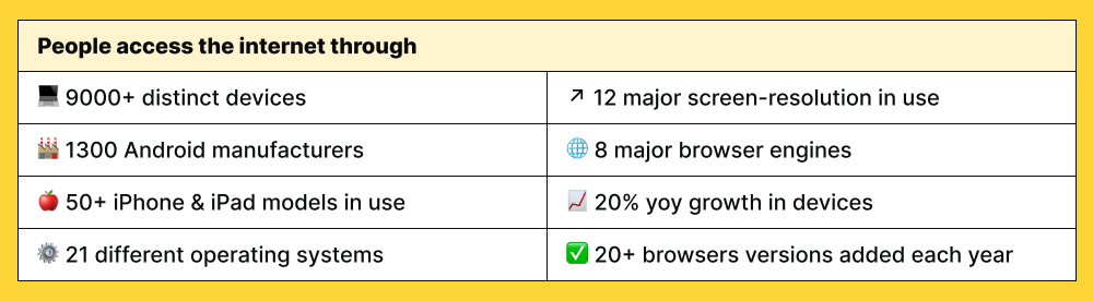 Testing has to cover many devices to ensure everyone gets the same smooth experience. What works on one device should work on all, and you've got to be ready for the next big thing in devices, too.