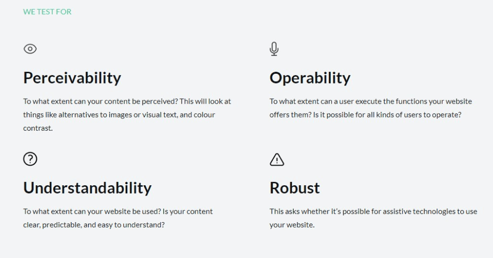 - Cognitive impairments: Assessment of the website's overall understandability, ensuring that content is clear, predictable, and easy for users with cognitive impairments to comprehend.