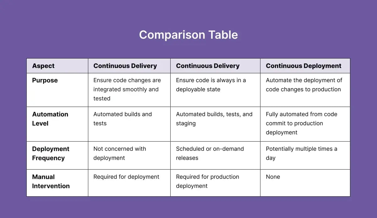 - Iterative Approach: Start with Continuous Delivery and gradually evolve towards Continuous Deployment as teams and processes mature.