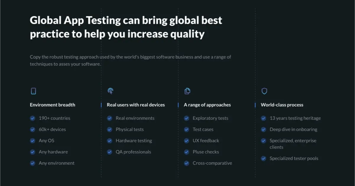 - Crowdtesting network: Provides access to thousands of professional testers across the globe, ensuring diverse device and OS coverage.