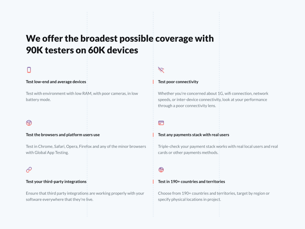 1. Device and platform/OS coverage – Your QA team may have multiple devices for testing, but it's impossible to cover every real-world situation. Still, testing on physical devices is imperative to the success of your app. And with over 60K devices, we offer just that.