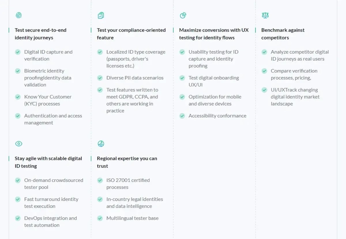 Global App Testing offers comprehensive digital identity testing services to ensure flawless identity proofing, KYC/AML compliance, and overall identity lifecycle management, no matter where in the world the testing occurs. Leveraging our network of real identities from over 190 countries, we rigorously test digital ID document capture, biometric facial recognition, and identity data verification against authoritative sources and more.