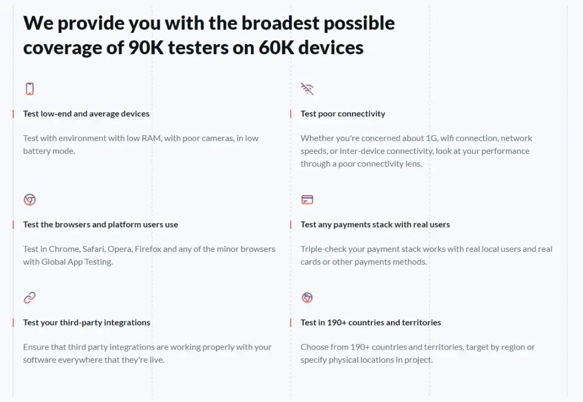 Global App Testing simplifies mobile app testing by providing access to over 90,000 testers in 190 countries. With access to 60,000 real devices, operating systems, and network setups, we offer valuable insights into real-world user experiences.