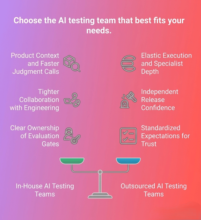 Outsourced AI testing teams win when you need elastic capacity, specialist coverage, and independent validation under real-world conditions.