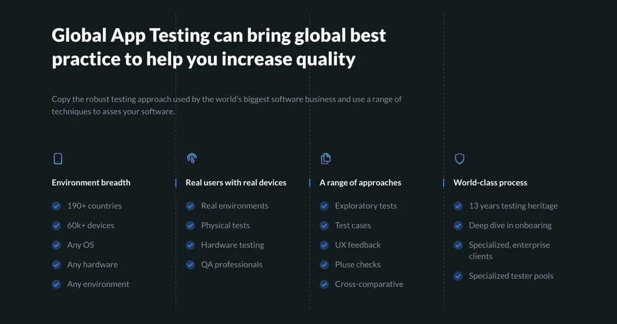 When it comes to payment testing, Global App Testing offers comprehensive services that cover testing with real users, virtual cards, global reach, and compliance-focused testing: