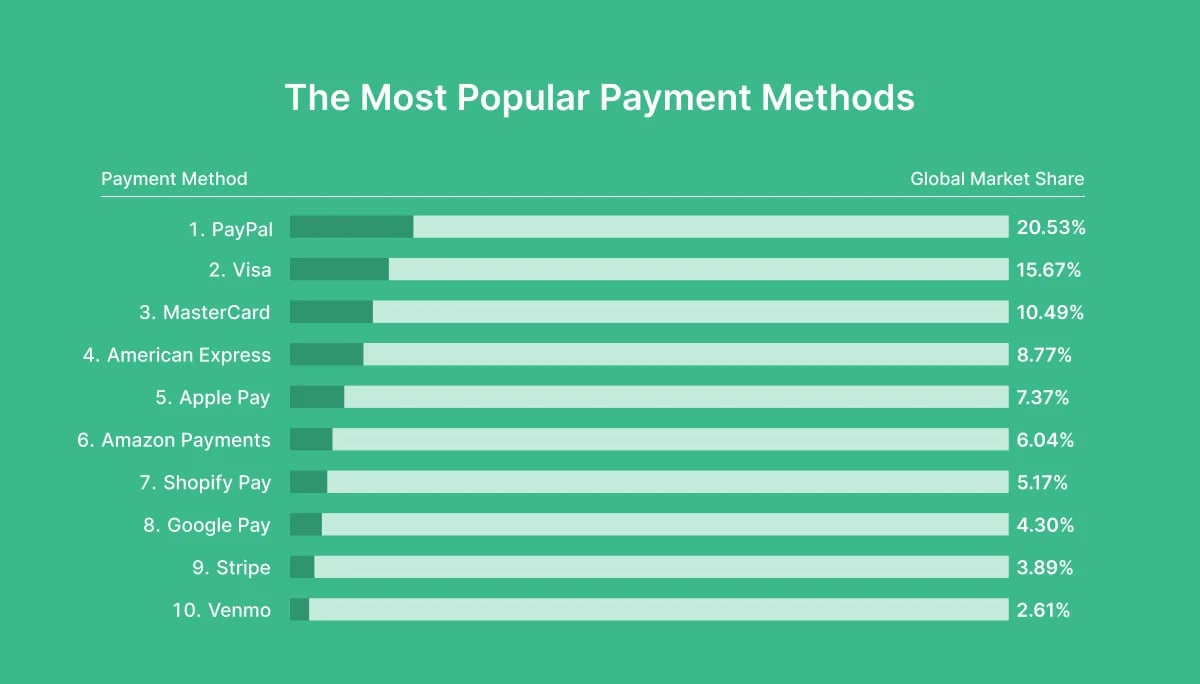 - Payment methods range from traditional options like credit and debit cards to newer alternatives like digital wallets.