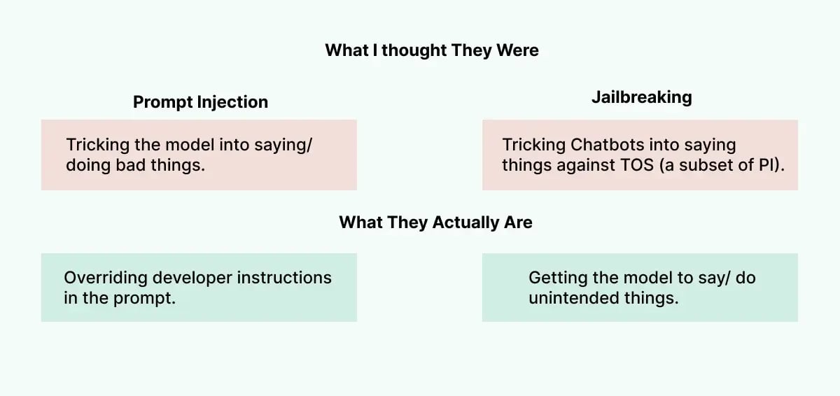 Prompt injection and jailbreaking are two different techniques used to exploit vulnerabilities in large language models (LLMs). Prompt injections disguise malicious instructions as user inputs, tricking the LLM into overriding developer instructions in the system prompt. In contrast, jailbreaking involves crafting prompts that convince the LLM to ignore its built-in safeguards, which are designed to prevent the model from performing unintended or harmful actions.