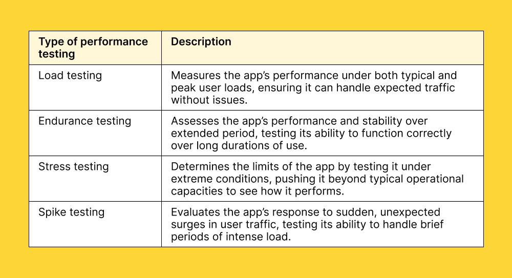 - Stress testing: Testing how the app performs when an unexpected viral event leads to a massive, sudden increase in user activity, far exceeding normal peak levels.