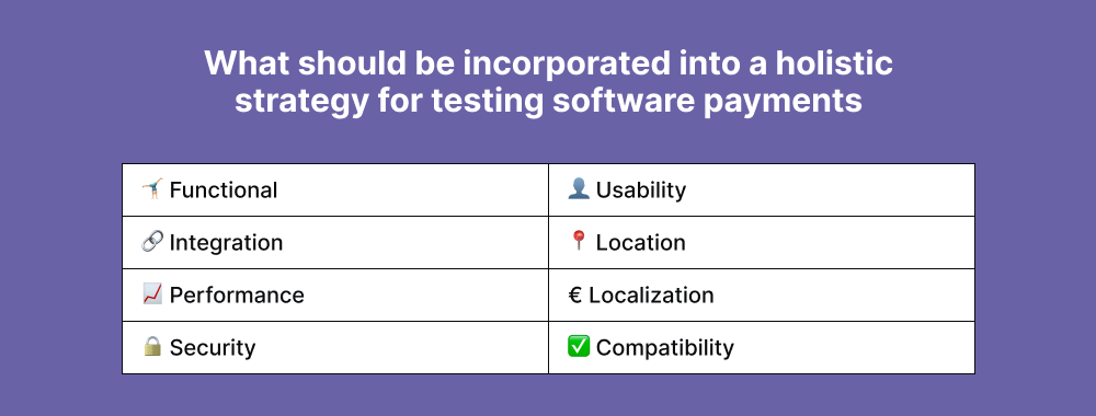- Third-party processor integration: Testing the integration with third-party services like PayPal or Apple Pay. It includes verifying that transactions are seamless and that user data is handled securely.