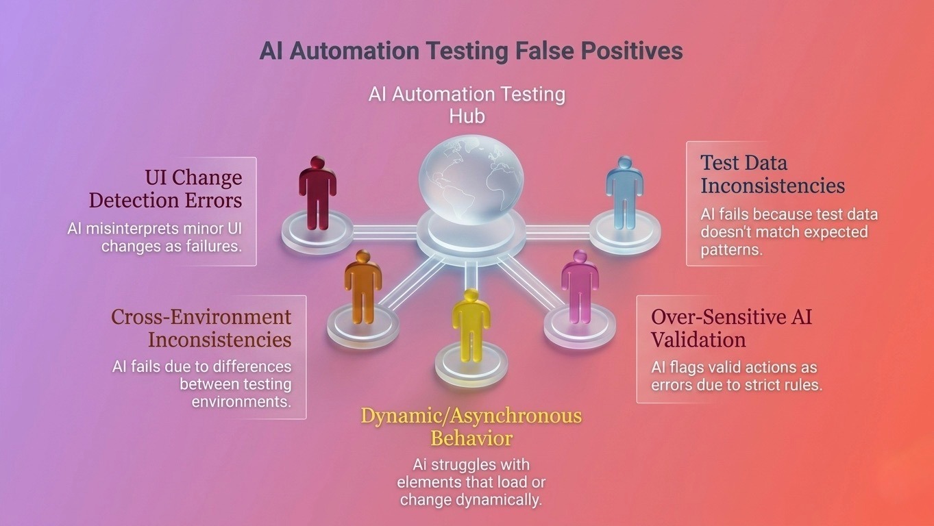 - False positives occur when AI automation testing passes even though a real defect exists, often due to UI changes, environmental differences, timing issues, or outdated test data.