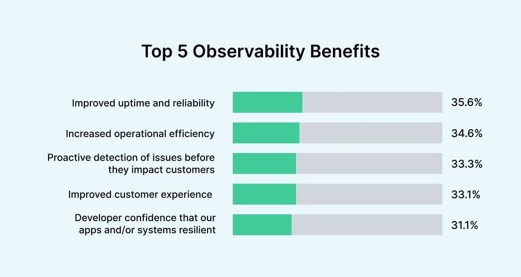 The New Relic survey respondents cite a range of clear and positive business benefits of implementing observability, from faster development speed and agility (27%) to better user experiences (23%) and improved productivity and employee morale (22%). Another important benefit is that it can increase the speed of innovation and lead to accelerated delivery to market (21%).