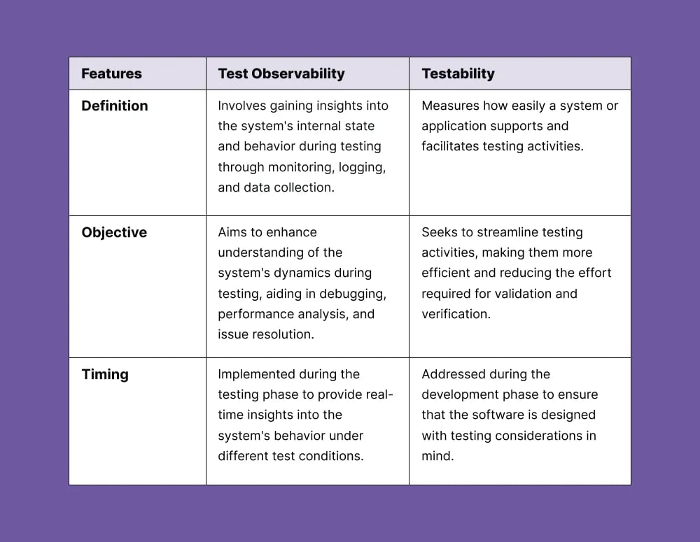Testability and Test Observability, though closely related in software testing, target distinct facets of the testing process. While Testability focuses on the ease of testing, Test Observability emphasizes gaining insights into the system's behavior during testing to aid in various analysis and resolution processes.