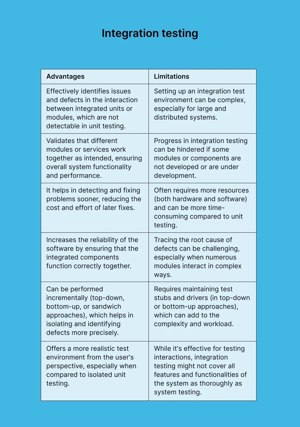 - Integration testing: Testing the interfaces and interactions between integrated units/modules.