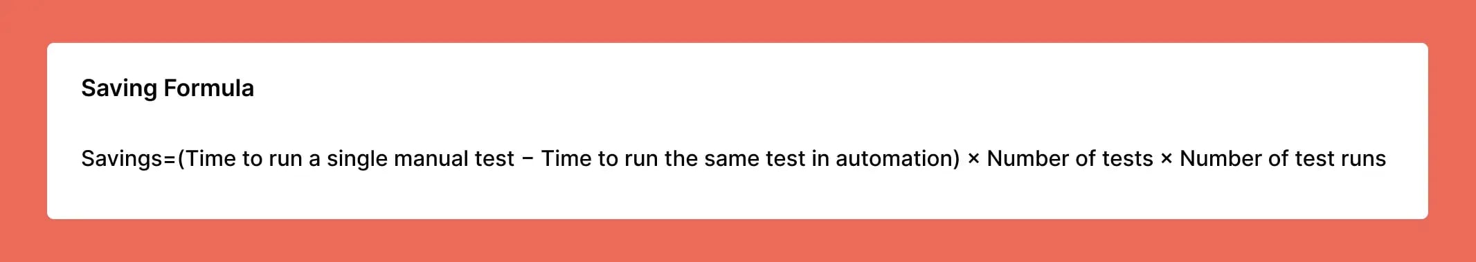 - Time saved per test run: This measures the reduction in execution time for automated tests compared to manual ones. It directly correlates with savings.