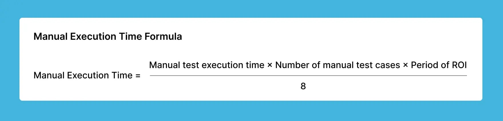 This quantifies the time it would take to execute all test cases manually over the same ROI period, allowing for a direct comparison with automated efforts. Converting total hours into workdays provides an actionable metric.