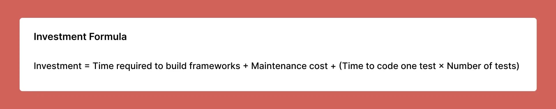 Investment includes all costs associated with setting up and maintaining the automation framework. This includes framework development, test case creation, and ongoing maintenance.