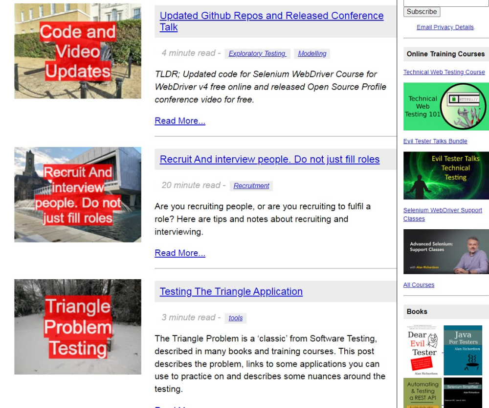 EvilTester is a blog focusing on various software testing and development aspects. It provides a range of content, including posts on specific technical topics, updates from the author, and summaries of content released on both the blog and Patreon. The blog covers a variety of subjects related to software testing, such as exploratory testing, test automation, and technical testing, along with insights into tools like Selenium WebDriver and API testing.