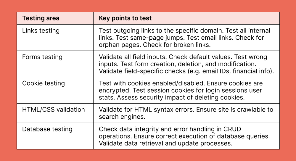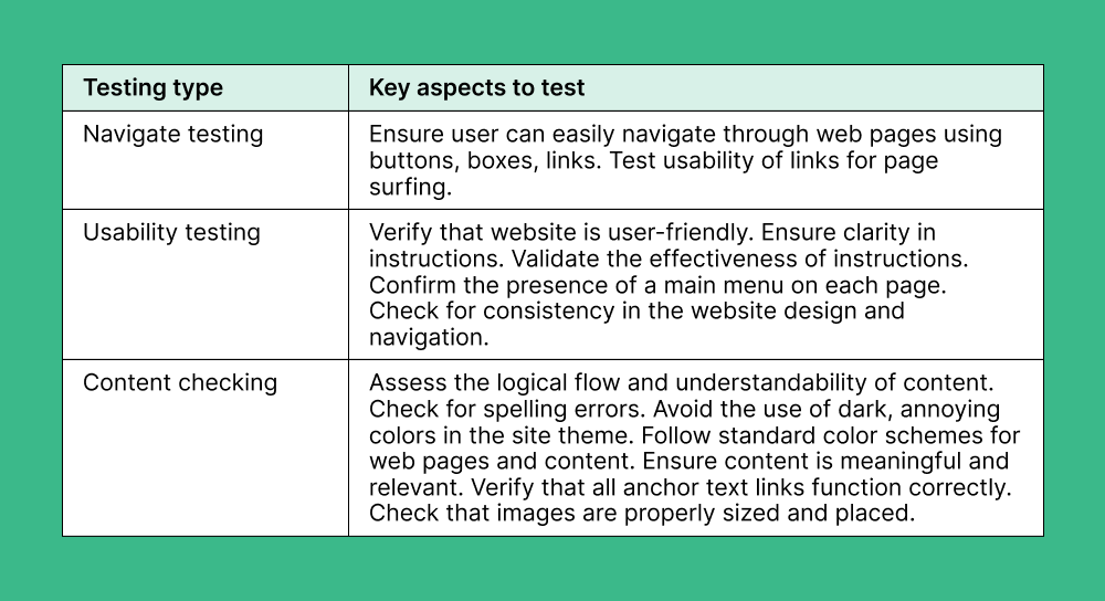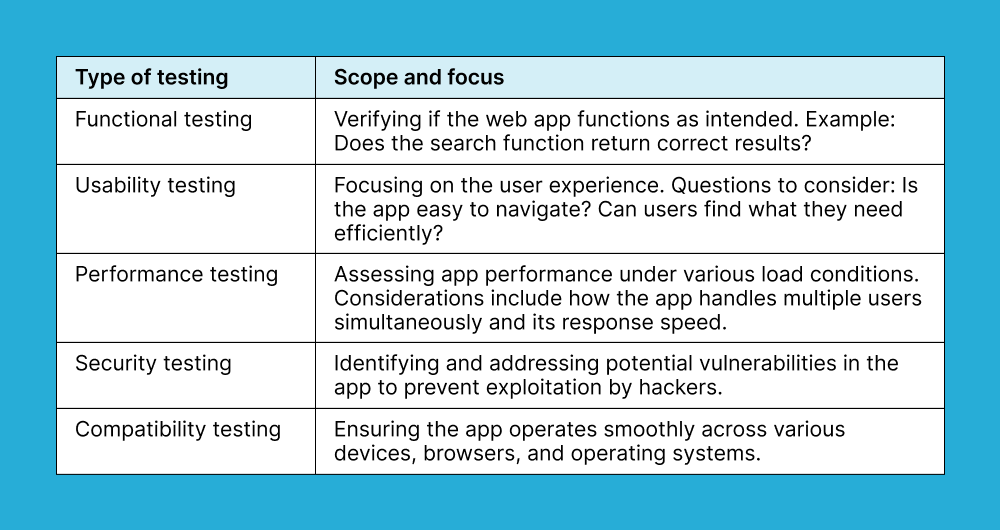 The scope of web app testing is quite broad and includes various types, each addressing different aspects of the app. These types include: