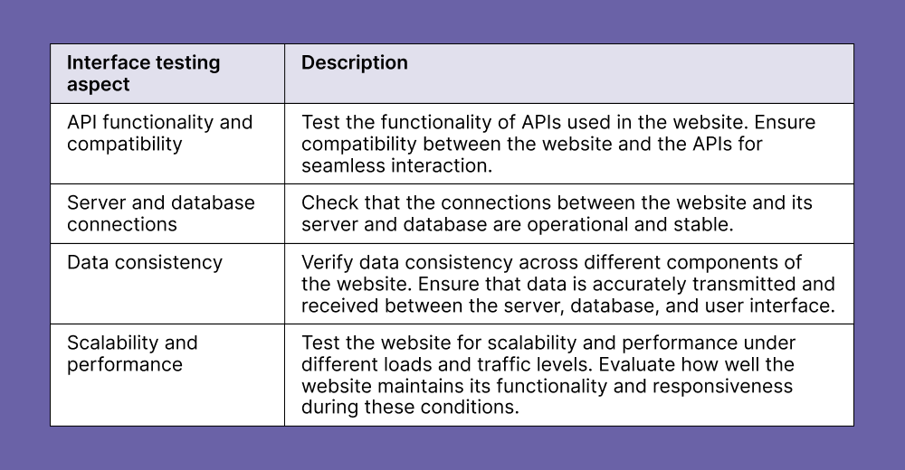 Interface testing in web app testing is a critical process that focuses on verifying the interactions between various web application components.