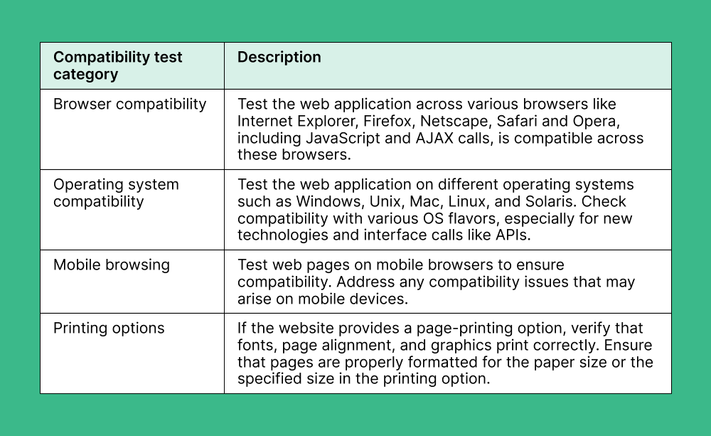 Compatibility testing ensures your web app works seamlessly across browsers, devices, and operating systems. It's about providing a consistent user experience regardless of the platform.
