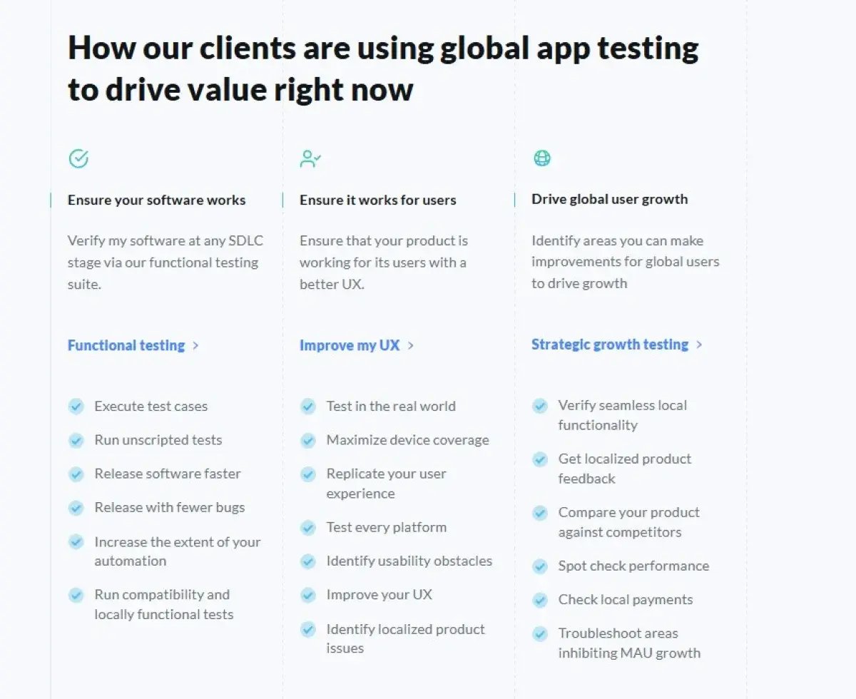 Working with Global App Testing means specialists in functional, performance, and localization testing cover each phase of your Software Testing Life Cycle. We test your app’s features and verify its performance and compatibility in real-world conditions that reflect your users’ experiences.