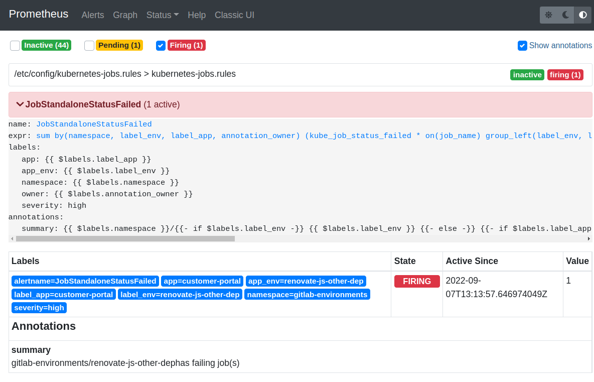 When you configure the alert, you can inspect it in Prometheus web UI: