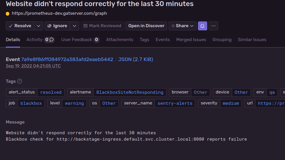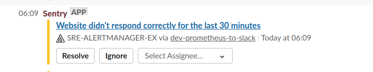 - For each alert, if its status is resolved, we try to find automatically created issue in Sentry and mark it as resolved automatically. We keep history in Sentry.