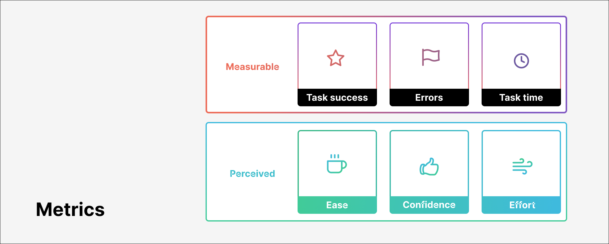 Using a mix of these metric types is a good idea to get a comprehensive view of any usability problems across the user experience.